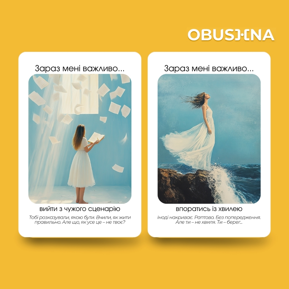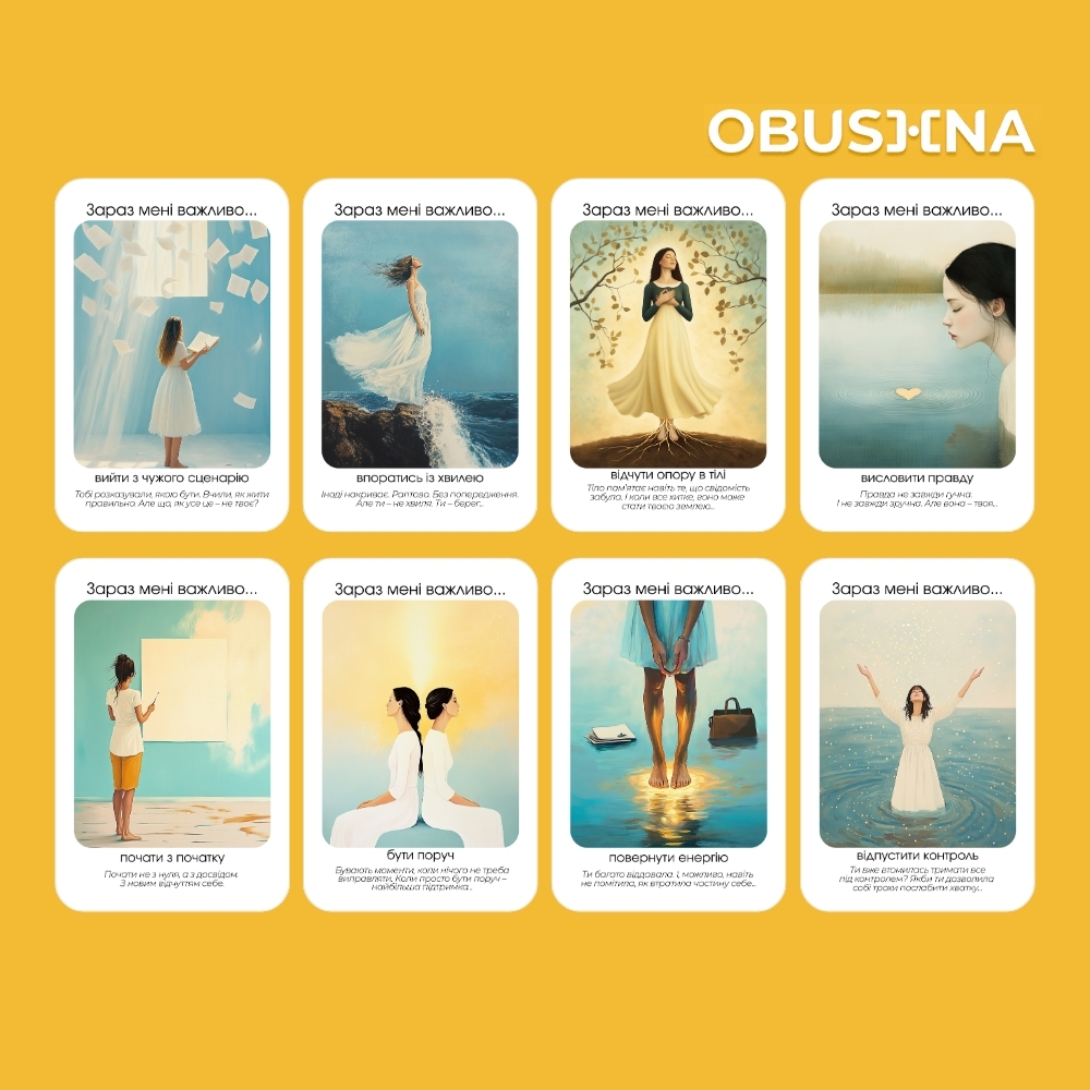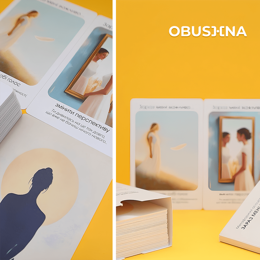 Кожен образ створено з особливою увагою до деталей. Це дозволило передати тонкі нюанси станів та настроїв, які резонують з фразами на картках. Формат карток 8,5 × 13 см обрано не випадково. Це оптимальний розмір для комфортної роботи – картки зручно тримати в руках, а зображення достатньо великі для детального розгляду.