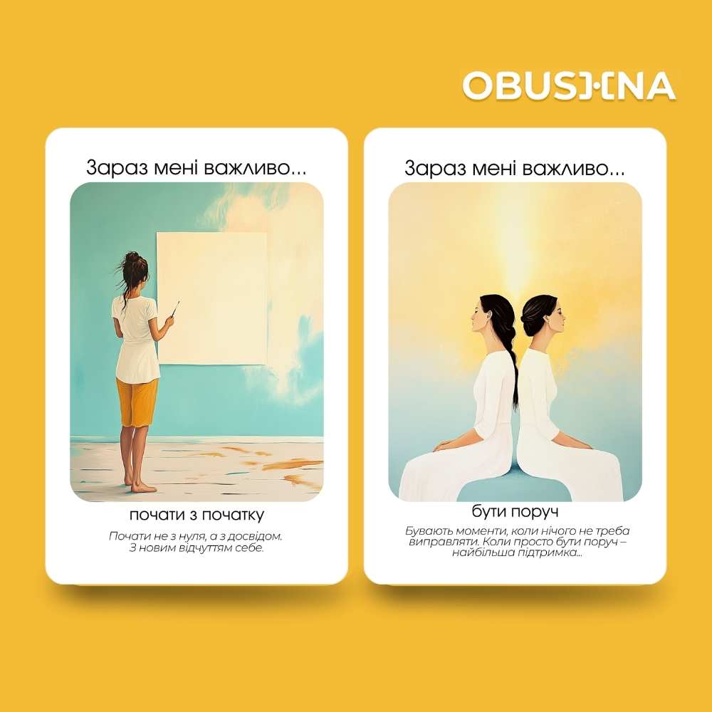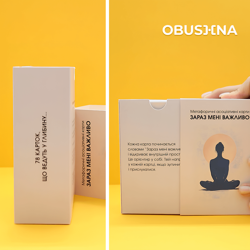 Сучасна людина щодня приймає близько 35 000 рішень. Від вибору одягу до глобальних життєвих змін. У цьому потоці інформації ми часто втрачаємо зв’язок з власними потребами та бажаннями. Набір “Зараз мені важливо” створений для тих, хто готовий зупинитися та почути себе. 78 карток з унікальними фразами починаються словами “Зараз мені важливо…” і ведуть до внутрішнього орієнтиру.