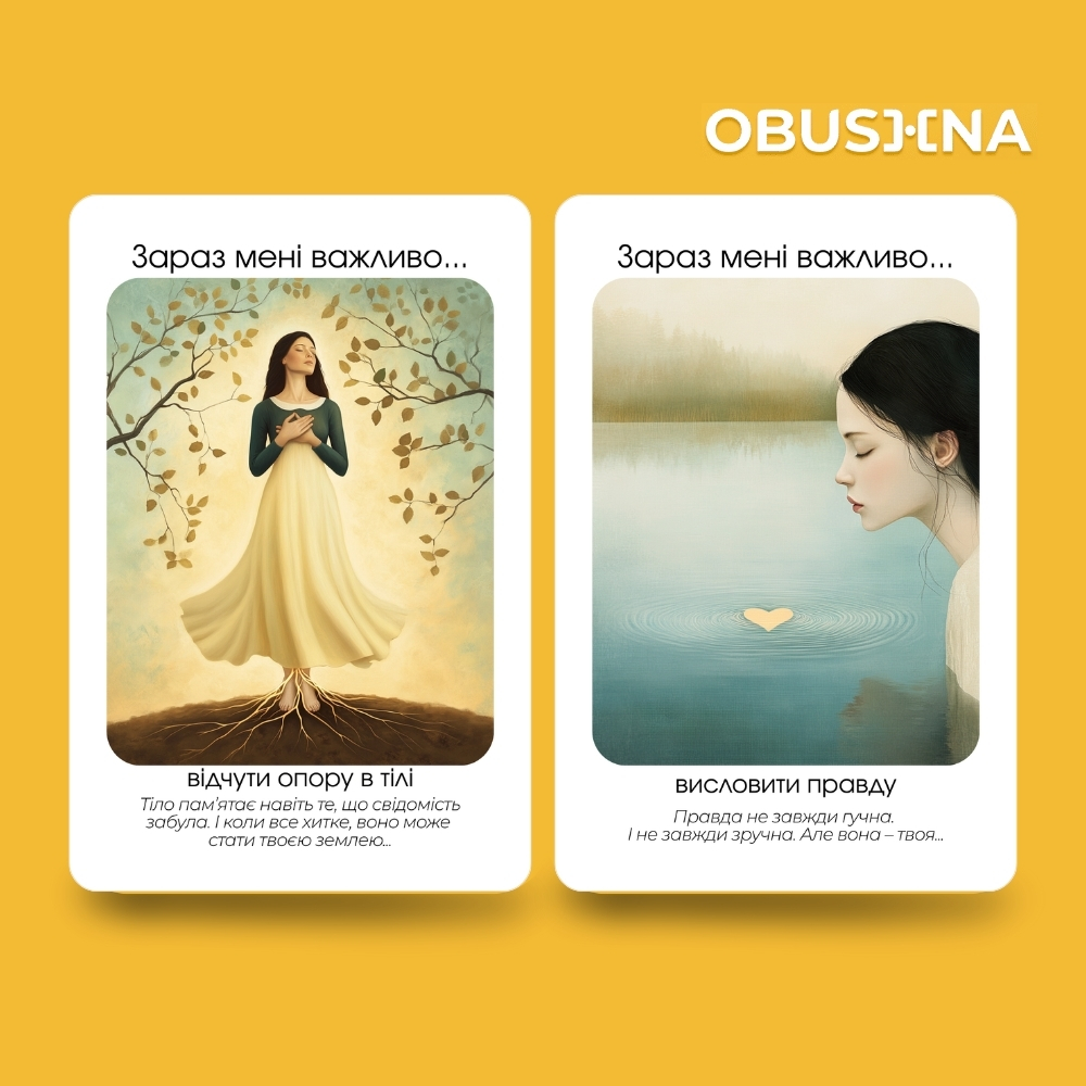 На відміну від класичних МАК, ці карти не дають порад чи настанов. Вони створюють простір для власних відкриттів через м’які, точні формулювання. Карти українською мовою особливо важливі для глибинної роботи. Рідна мова має прямий доступ до емоційної пам’яті та дитячого досвіду.