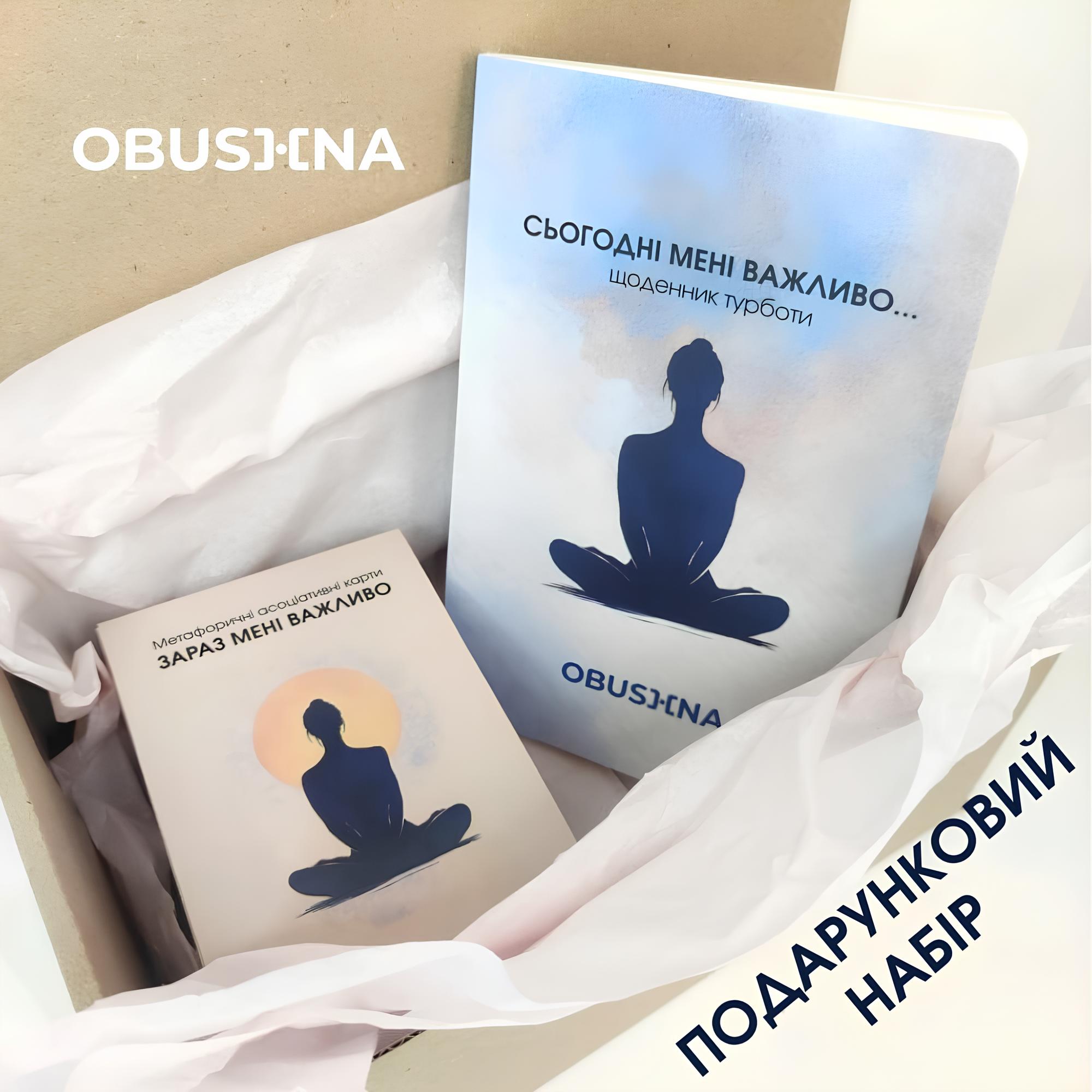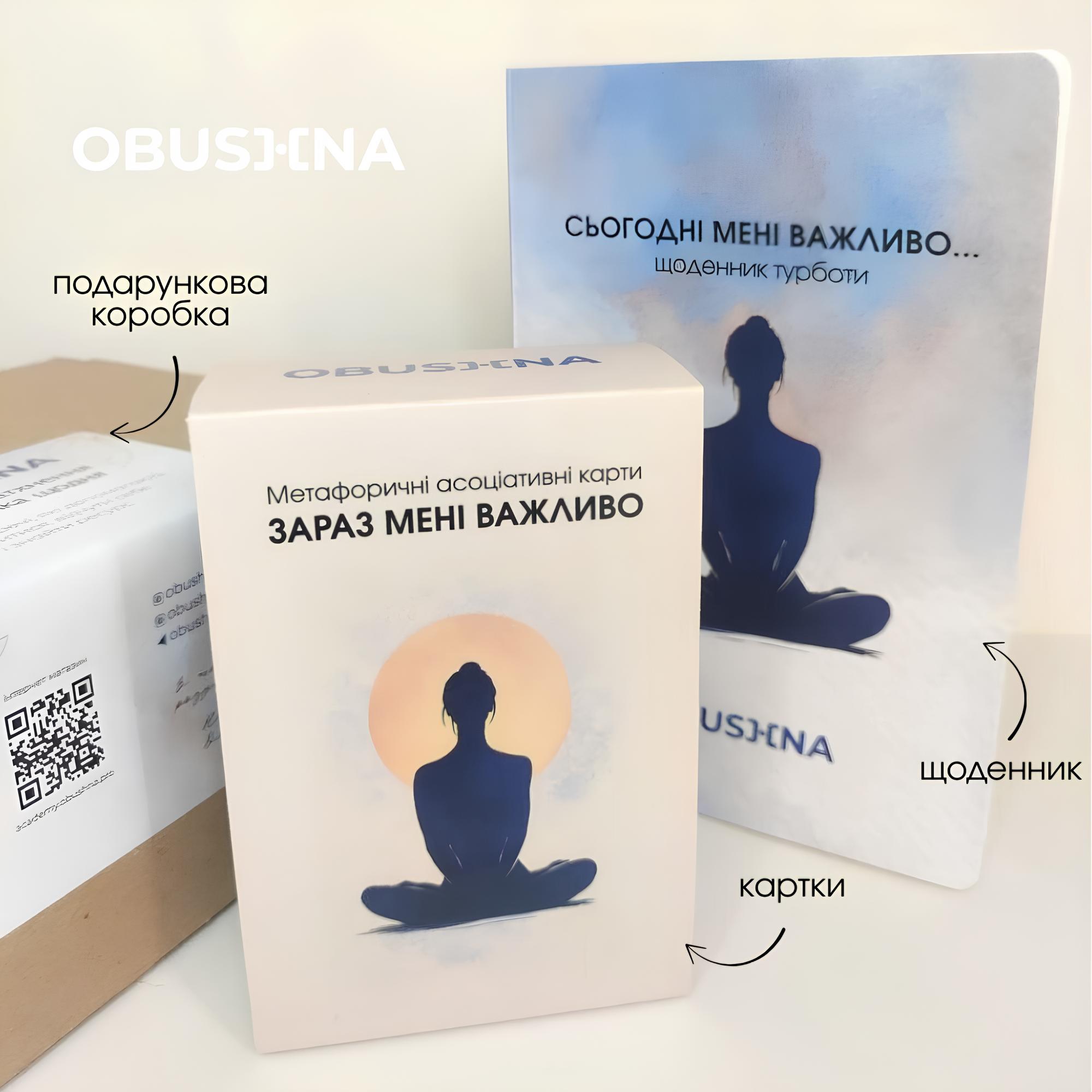 Набір зі щоденником і метафоричними картками Obushna.pro «Ясність і турбота» поєднує два інструменти, які доповнюють один одного у процесі рефлексії: метафоричні картки «Зараз мені важливо» та щоденник «Сьогодні мені важливо».