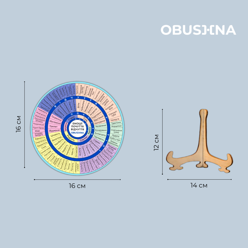 Міні колесо емоцій має діаметр 16 см, виготовлене з ПВХ, стоїть на дерев’яній підставці, не боїться вологи й не займає місця. Його можна тримати вдома, в офісі чи навіть у подорожі. Воно не «вчить» — воно нагадує: зупинись, відчуй, назви. У комплекті є буклет із вправами, але головна користь — у регулярності, а не в складності.