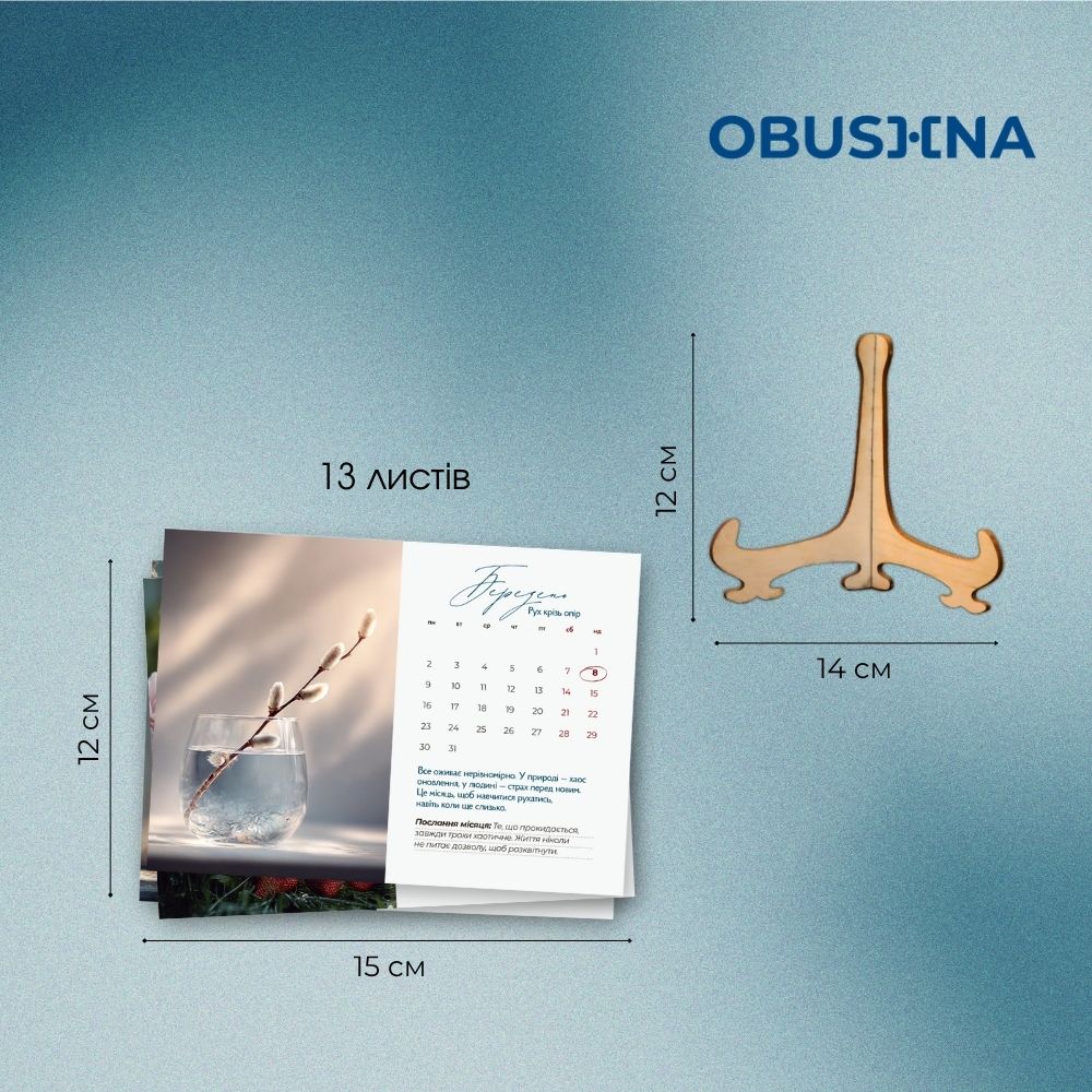 • 📚 Формат: Настільний календар із дерев’яною підставкою, 13 двосторонніх аркушів (12 місяців + обкладинка), 15 × 12 см, , подарунковий конверт